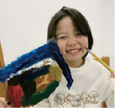 昨年の12月24日、透明の下敷きに水彩絵具で絵を描いてもらいました。「カカオをイメージして描いた。食べた時の気持ちを色で表現しました」と心春さん。20枚かき続け、1枚目に描いた絵を使用しました。